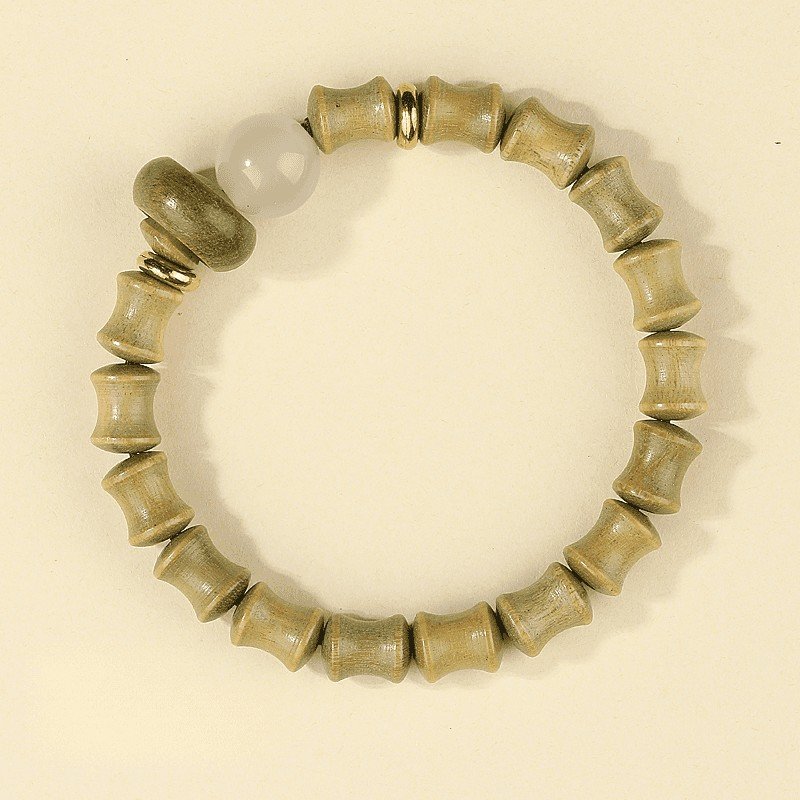 I'm truly captivated by the unique beauty of this bracelet. The dark brown bamboo-joint beads have a wonderfully organic feel and a smooth, polished finish that feels great against the skin. The combination with the larger cylindrical wood bead, the translucent light-colored stone, and the two golden spacers creates a perfectly balanced and artistic look. It sits comfortably on the wrist and has a subtle, grounding presence. I love wearing it during quiet moments at home – it pairs beautifully with simple, cozy loungewear (like the soft pink and white textiles you might spot in the background!). The craftsmanship is excellent. A truly unique and meaningful piece that I enjoy more every day.