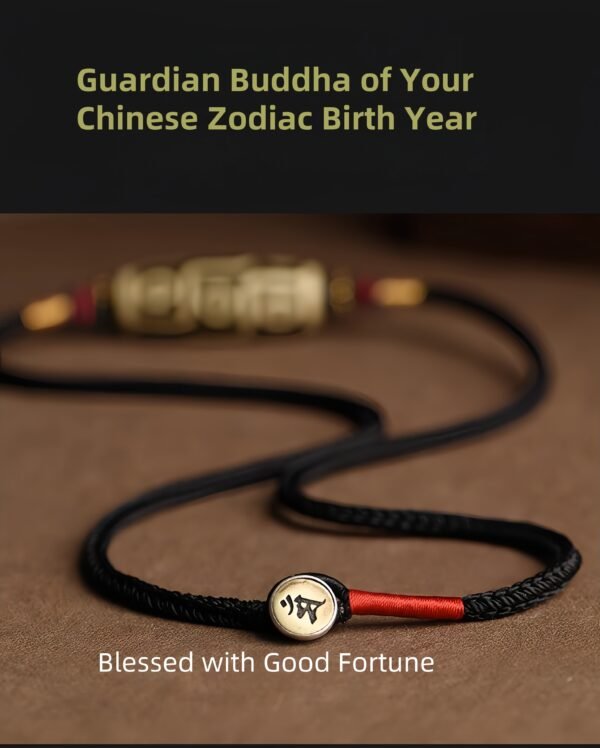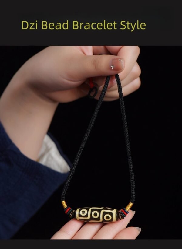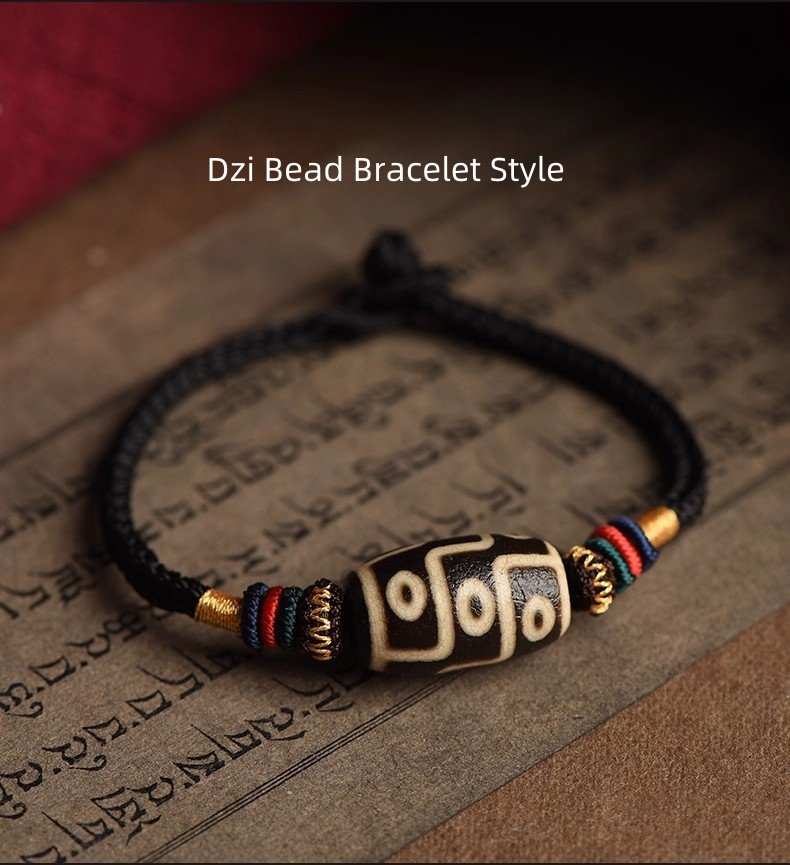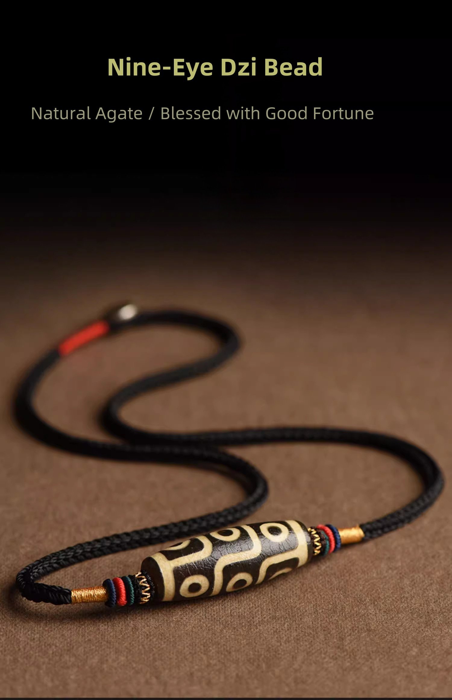 • Material: Hand-strung on black braided cord with Dzi bead and auxiliary beads (red, blue, gold)