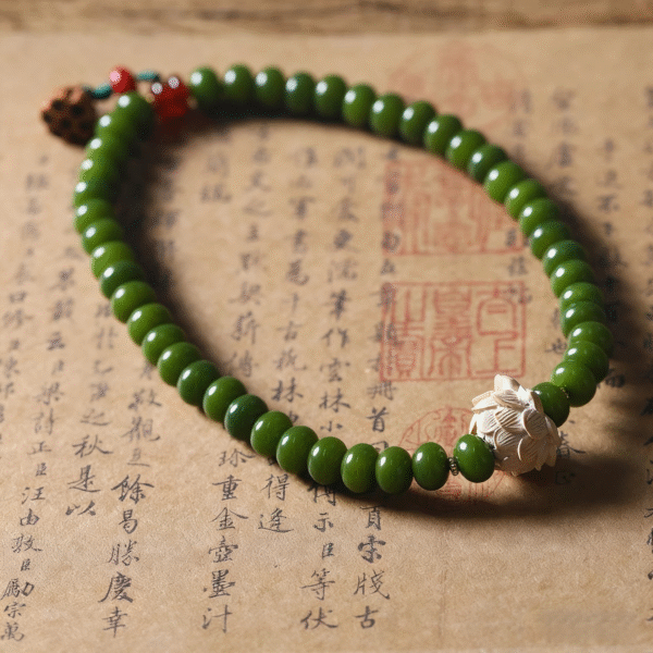 The bracelet uses green Bodhi seeds. In many traditions, these seeds mean wisdom and peace. Also, the double strand design shows connection and harmony. Then, the lotus seed pod tassel adds a natural touch. Because of this, the whole piece is full of good symbolism.